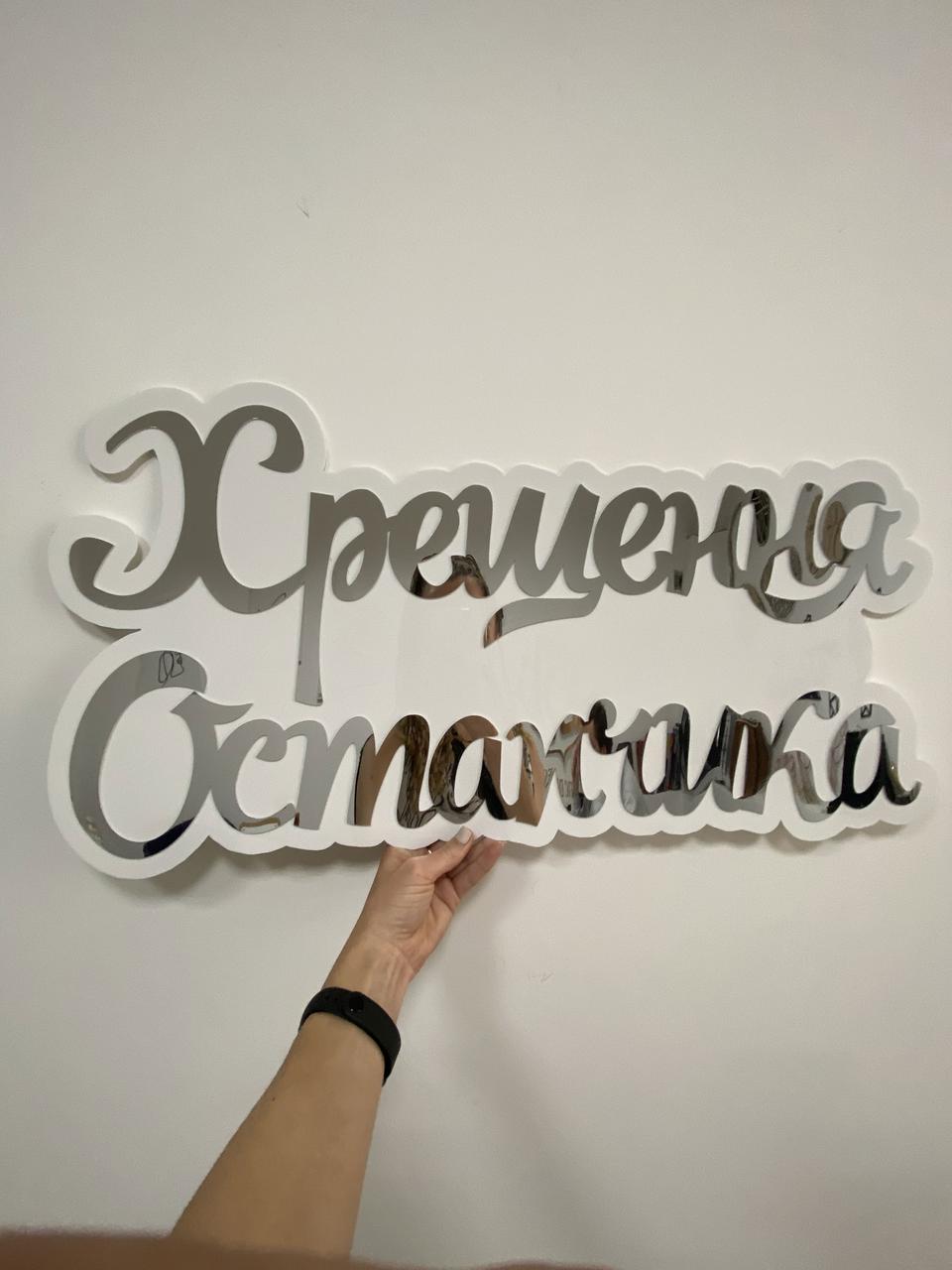 Ім'я та слово хрещення Manific Decor із дзеркального пластику на білій підоснові хрещення Срібло Ширина 70